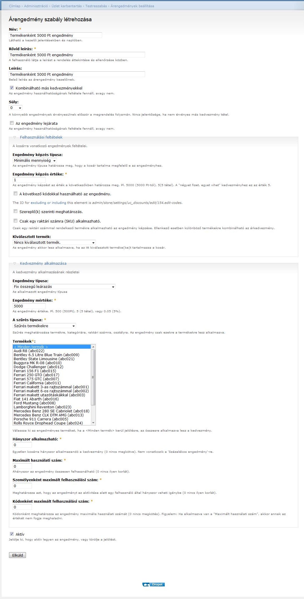 Figyelmesen nézzétek meg a beállításokat! A kedvezménynek nincs lejárata, tehát amíg aktív működik. A súlya 0 értékű, tehát kedvezmény képzésnél, több elemi engedménnyel együttmüködve, a könnyebbek előtte, a nehezebbek utána hajtódnak létre, hatálya minden termékre vonatkozik, ahány termék van a kosárban annyiszor lesz elszámolva.